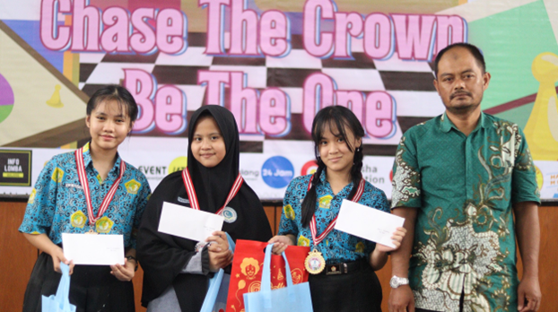 BANGGA: Tiga juara lomba story telling Atania Avita Safa juara 3 (paling kiri), Devitrigyan Khadijah Kurniarty juara 2 (dua dari kiri), Jesselyn Regeena juara 1 (tiga dari kiri) berpose bersama Guru PJOK SMAN 4 Malang Eko Fibriono (paling kanan) menggunakan medali, gooodie bag, dan amplop berisi uang pembinaan.